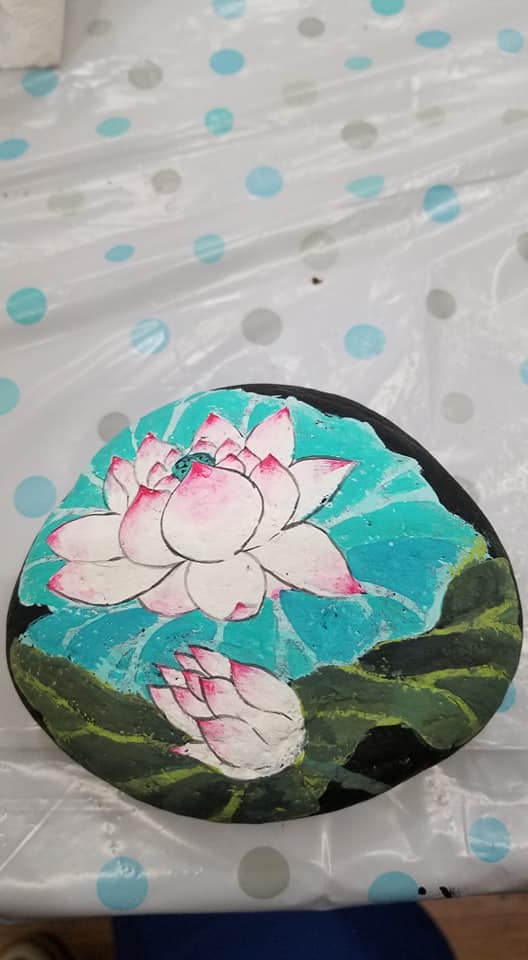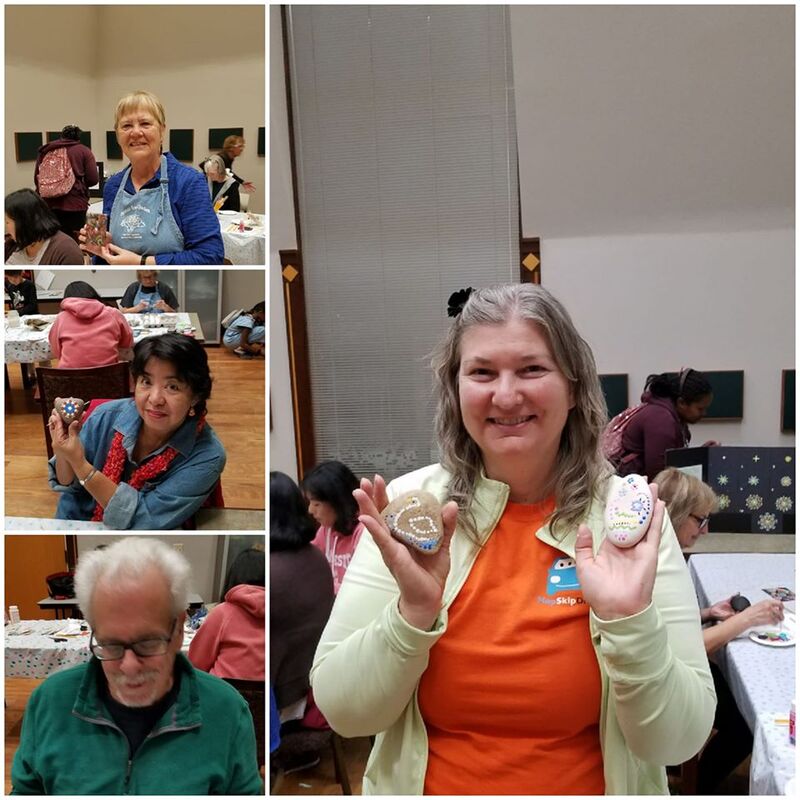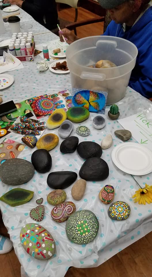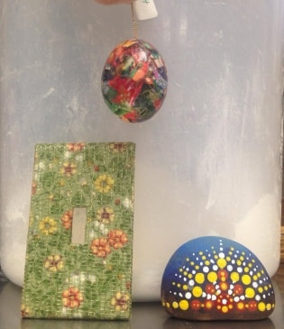 The NGAC has hosted three Make ‘n Take events. At the first event in December 2018, participants created earrings and/or decoupage eggs. The two events at the end of 2019 primarily involved rock painting, but attendees could also decoupage fabric onto a switch plate cover. All of the events were a lot of fun for everyone. Here are some of the participants with their works in progress or finished art. |